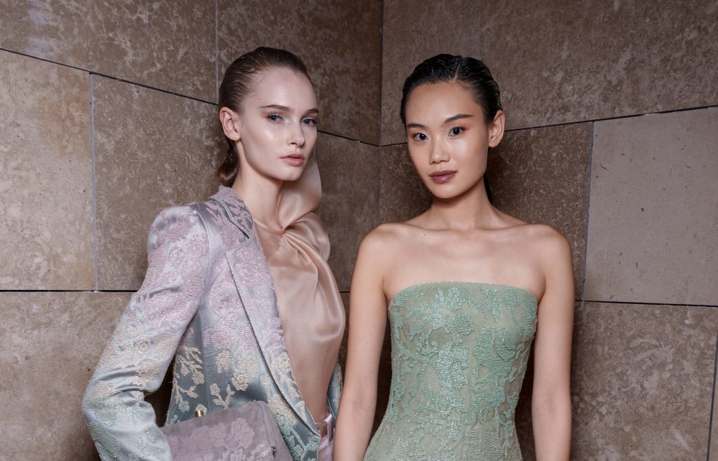 Pürüzsüz ve kusursuz bir cilt görünümünün eşlik ettiği makyajda, gözlerde yumuşak yeşil ve sıcak şeftali-pembe tonları şampanya ışıltılarıyla tamamlanırken, dudaklarda doğal gül tonlarında hafif bir renk dokunuşu öne çıktı. Armani Global Makeup Artist Hiromi Ueda imzası taşıyan bu görünüm, koleksiyonun zarif ve rafine ruhunu yansıttı.